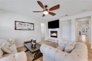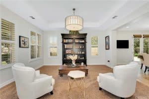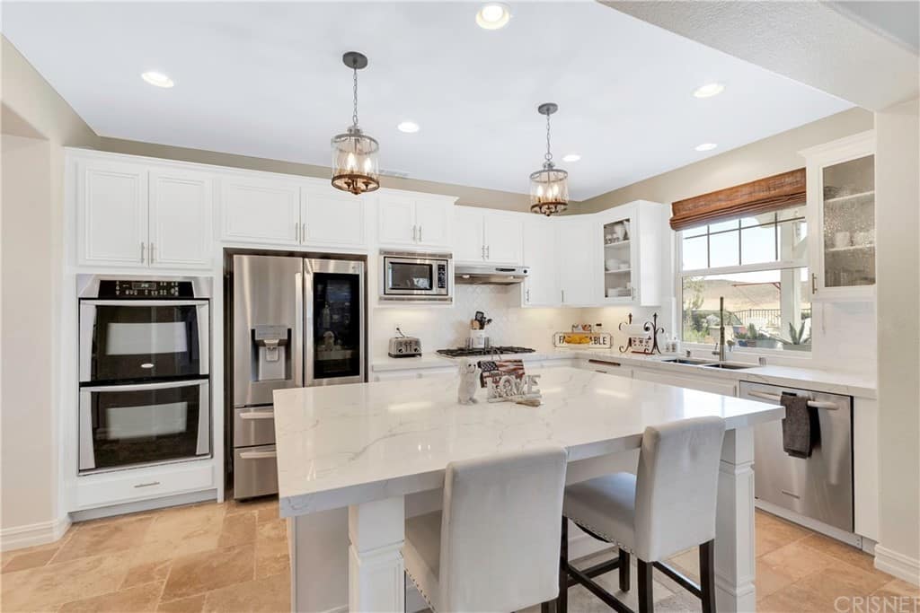 Kitchen features Custom White Cabinets with Quartz Countertops, Oversized Center Island with Hanging Lanterns, and Stainless Appliances. The kitchen opens up to the outdoor patio and BBQ – perfect for entertaining indoors and outdoors. There is a built-in media center with custom shelving and surround sound in the adjacent family room, as well as a fireplace with seating. Guest/Maid’s Room Downstairs with Full Bathroom and Laundry.