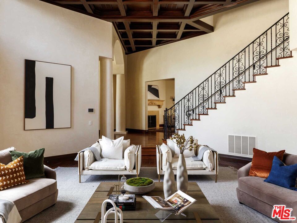Take a grand staircase to the main house entryway and step into a sumptuous foyer that leads to an airy main living room boasting walnut floors, chandelier lighting, coffered ceilings and Limestone fireplace adorned with Spanish tiles.