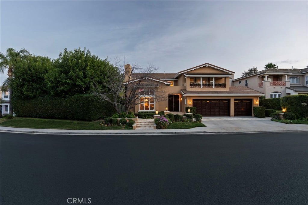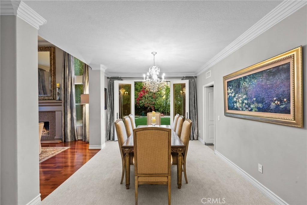 Throughout the home, crown molding, custom drapery, and a seamless blend of cherry hardwood and travertine flooring create an ambiance of refined luxury. The chef’s kitchen is a culinary masterpiece, boasting top-tier appliances, two-tone marble countertops, and Versailles-patterned porcelain flooring.