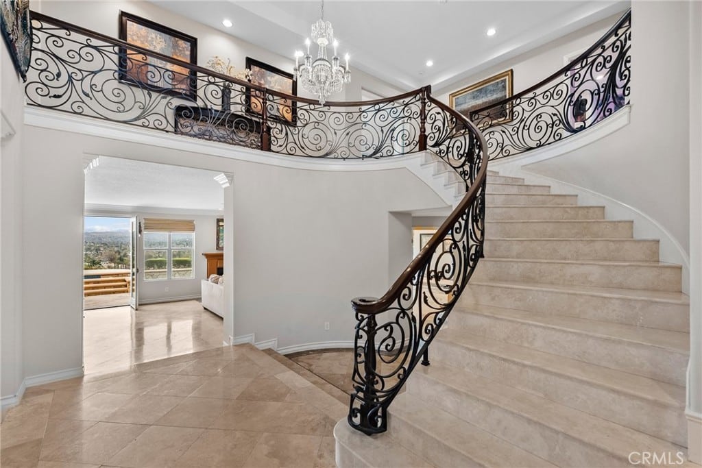 Step into The Abbeywood estate in Monte Vista, where timeless elegance meets modern sophistication. Designed for the most discerning tastes, this exquisite home offers breathtaking panoramic views of the Santa Monica Mountains from the moment you enter. A custom wrought-iron staircase and grand foyer set the tone for an unparalleled living experience.