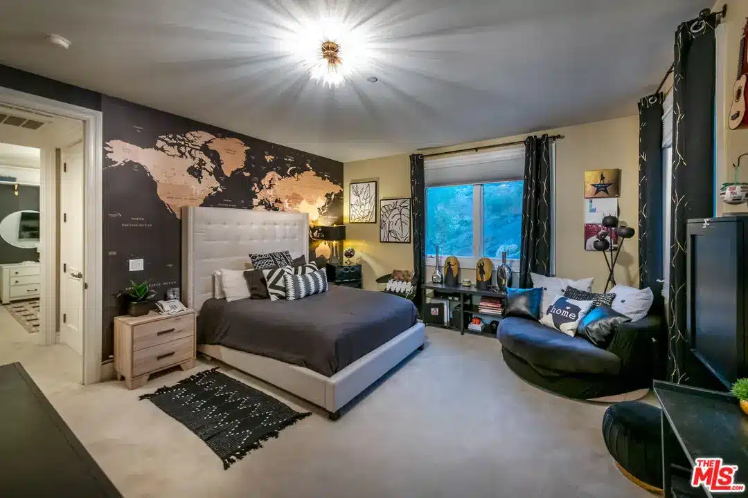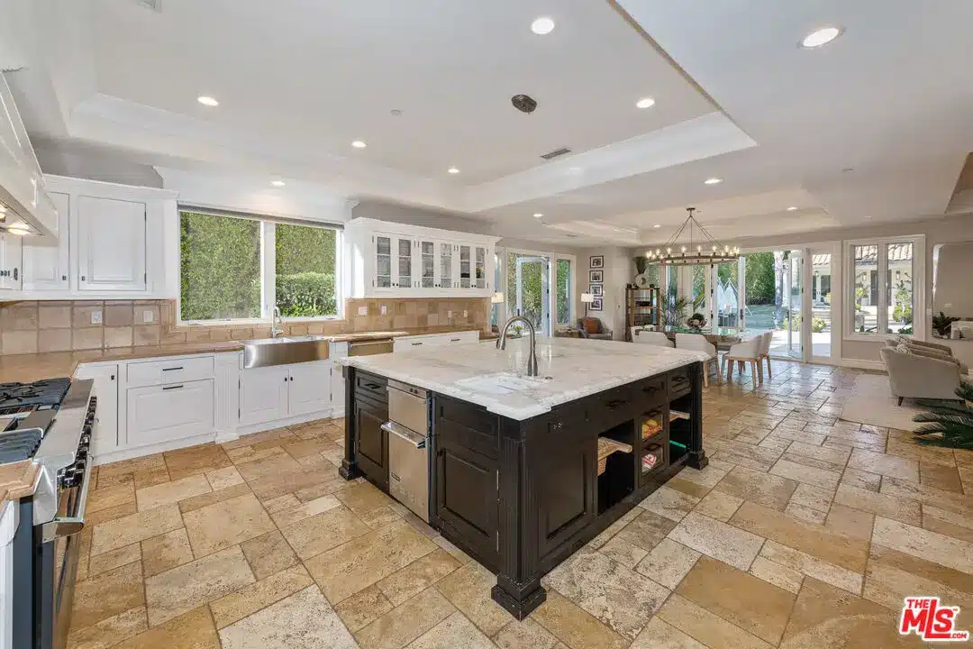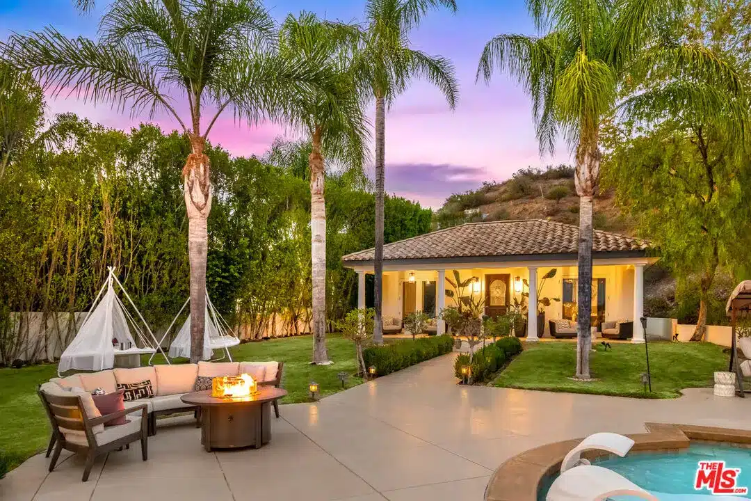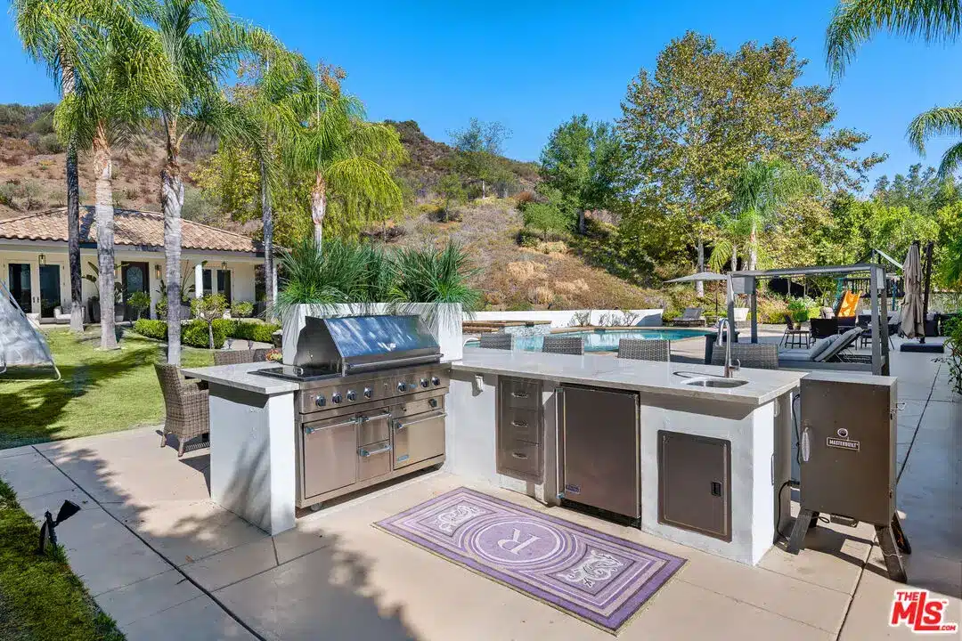 Adding to this idyllic compound are two garages along the extensive driveway that present stunning vistas of the Santa Monica mountains. The landscaped grounds include mature palms, a sizable grassy area, shimmering pool with baja step and spa, built-in outdoor entertaining BBQ sector featuring bar seating – perfect for entertainment!