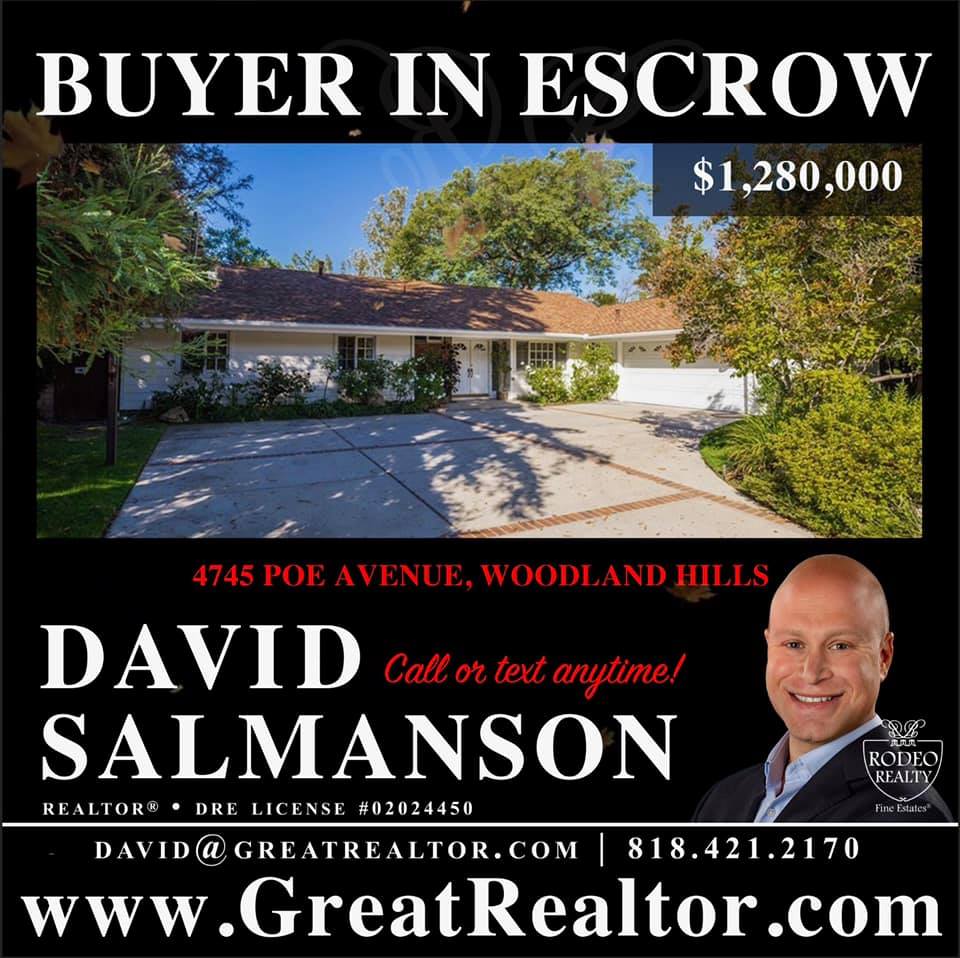 Another Woodland Hills home in escrow! Posted by David Salmanson on September 27, 2019 Home Sales 0 Comments Another home in escrow in Woodland Hills, CA. THis beautiful home on 4745 Poe Avenue is a great buy! Lots of excitment for the buyers and sellers! Woodland Hills home in escrow