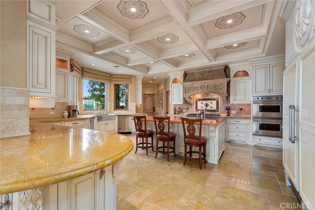 Its noteworthy features include a sizable center island chef’s kitchen with twin Sub Zero refrigerator/freezers and four refrigerated drawers, four ovens, a 6 burner cooktop, two dishwashers, two sinks and a large walk in pantry all complemented by stone floors and counters.