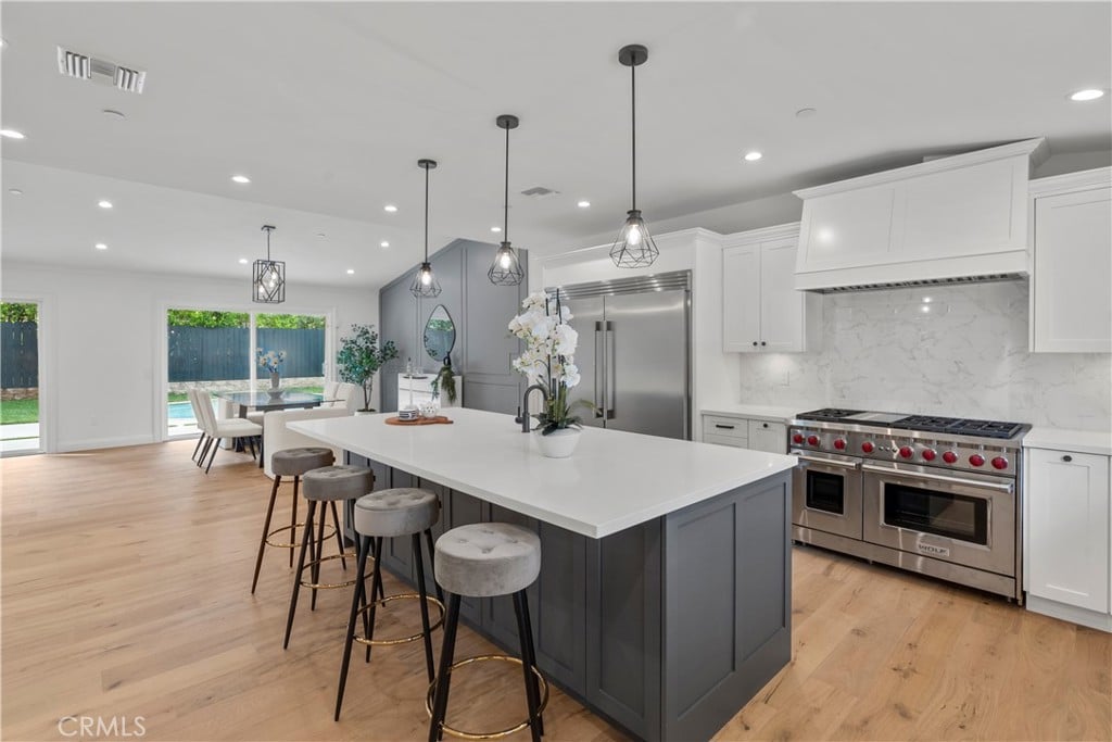 Continuing on, you’ll find the custom-designed kitchen, seamlessly merging modern functionality with stylish design. The 9′ quartz island steals the show, accompanied by matching countertops to create a perfect blend of form and function.