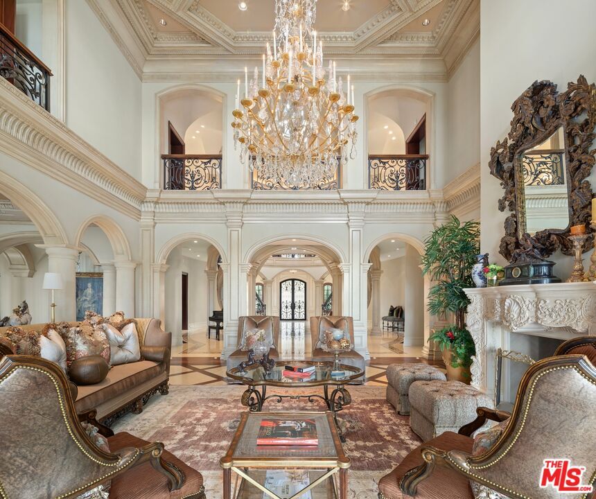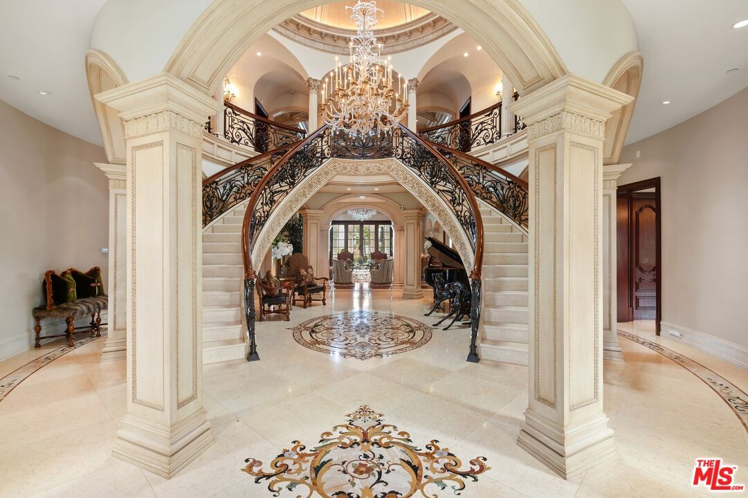 With nearly 17,000 square feet of luxury and superior craftsmanship, the residence showcases a majestic limestone exterior and occupies a sprawling, supremely secluded corner lot. Enter through a grand foyer featuring a soaring 30-foot domed ceiling embellished with intricate French moldings, flanked by two gracefully floating staircases.
