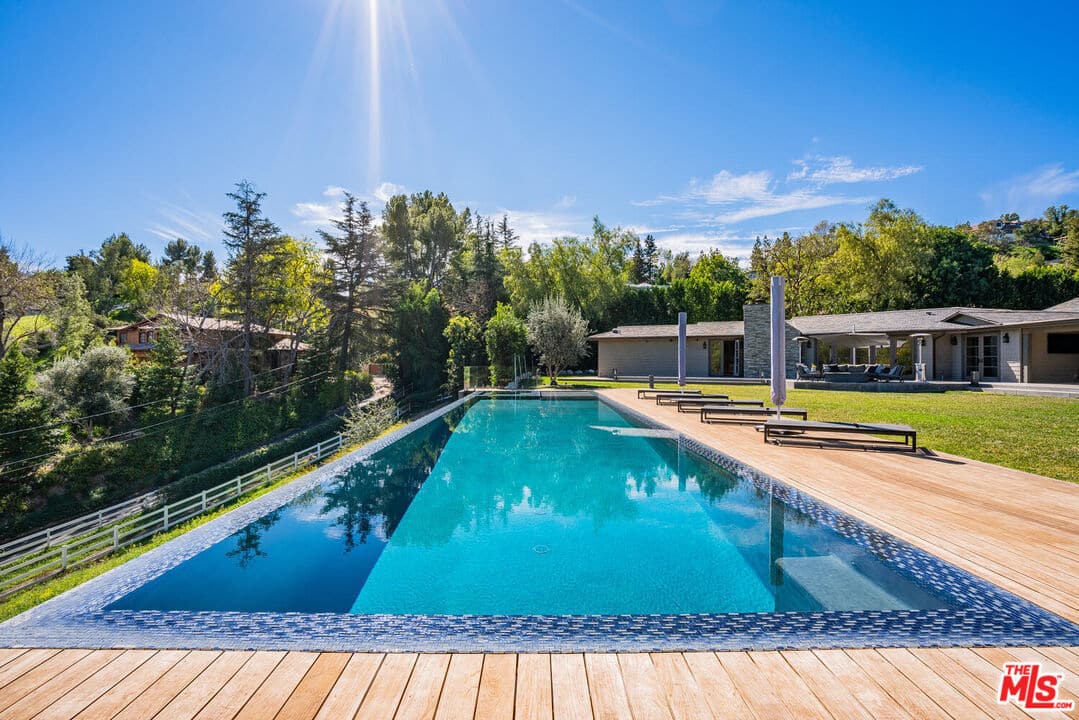 A 65 foot zero edge infinity pool/spa and outside bath complete this Calabasas Extravagance Home. There is also an outdoor kitchen, multiple firepits, and multiple firepits. It is equipped with surround sound throughout. Every detail in the house has been carefully considered.