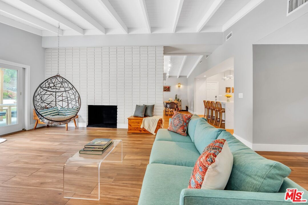 The living and dining areas delight with a dual-sided fireplace while the backyard provides an idyllic setting for leisure, relaxation, and outdoor entertainment, newly hardscaped for your pleasure.