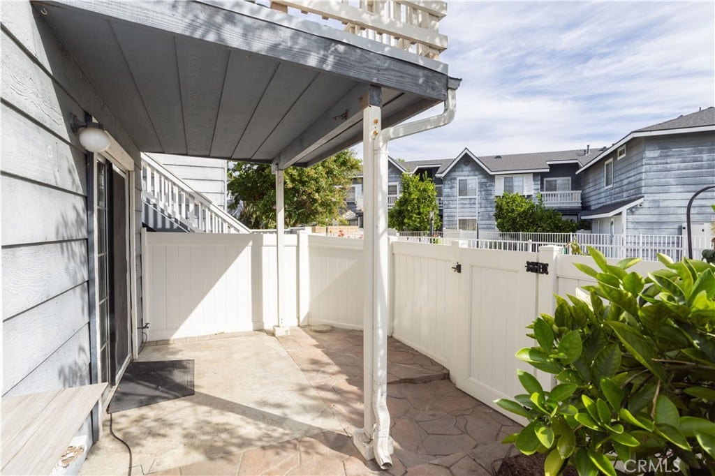 The living room extends to a delightful patio with vinyl siding and a stone floor, perfect for outdoor relaxation and hosting barbecues.