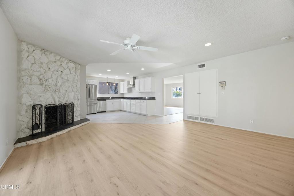The adjacent family room boasts a cozy stone fireplace, new engineered flooring, and sliding doors that open to a private backyard retreat with a sparkling pool, perfect for entertaining. A separate laundry room offers ample storage, while central heating and air conditioning ensure year-round comfort. The home also includes a two-car garage for added convenience.
