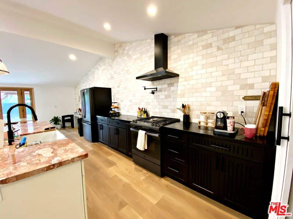 Step inside this Contemporary Woodland Hills Pool Home and you’ll find vinyl flooring, an open chef’s kitchen that boasts an extra large island, marble & quartz countertops, two-tone custom solid wood cabinetry, matte black GE appliances and breakfast nook.