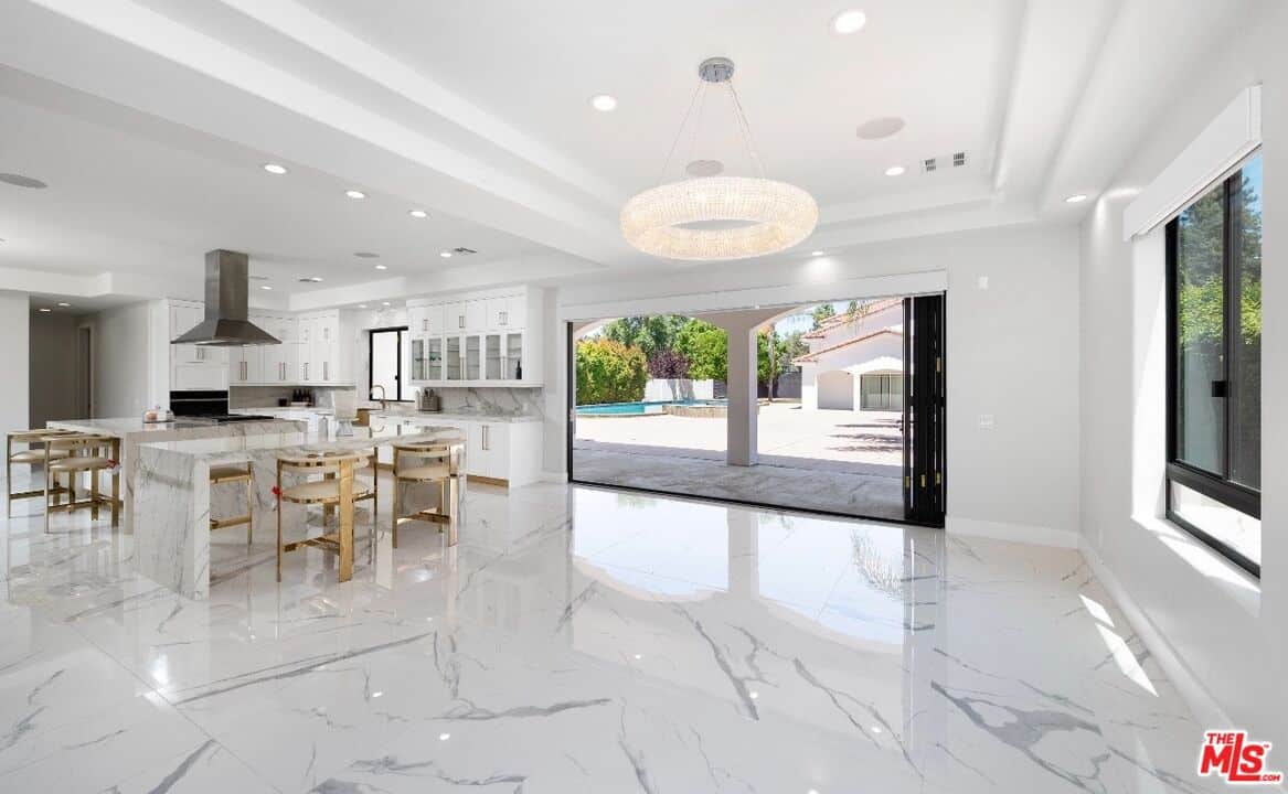 Dine in style in the sophisticated formal dining area under a mesmerizing circular chandelier offering its dazzling light to all who reside. The Woodland Hills Estate sets a unique standard of luxury living. The open chef’s kitchen shows off pristine white cabinetry and top-of-the-line Wolf appliances, inviting you to create culinary delights.