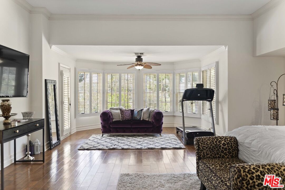 The Custom Built Calabasas Mansion has two bedrooms on the ground level and four on the second level of the home feature a walk-in closet and attached full bathroom (one Jack-and-Jill bathroom on the second level and a standard closet on the ground level). Featuring a spacious sitting room, two large walk-in closets, an additional third closet, a shoe closet, and a walkout balcony overlooking Calabasas hills, the primary bedroom offers a peaceful retreat. There are dual vanities, a skylight, a steam shower, a jetted bathtub, and a linen closet in the luxurious primary bath.