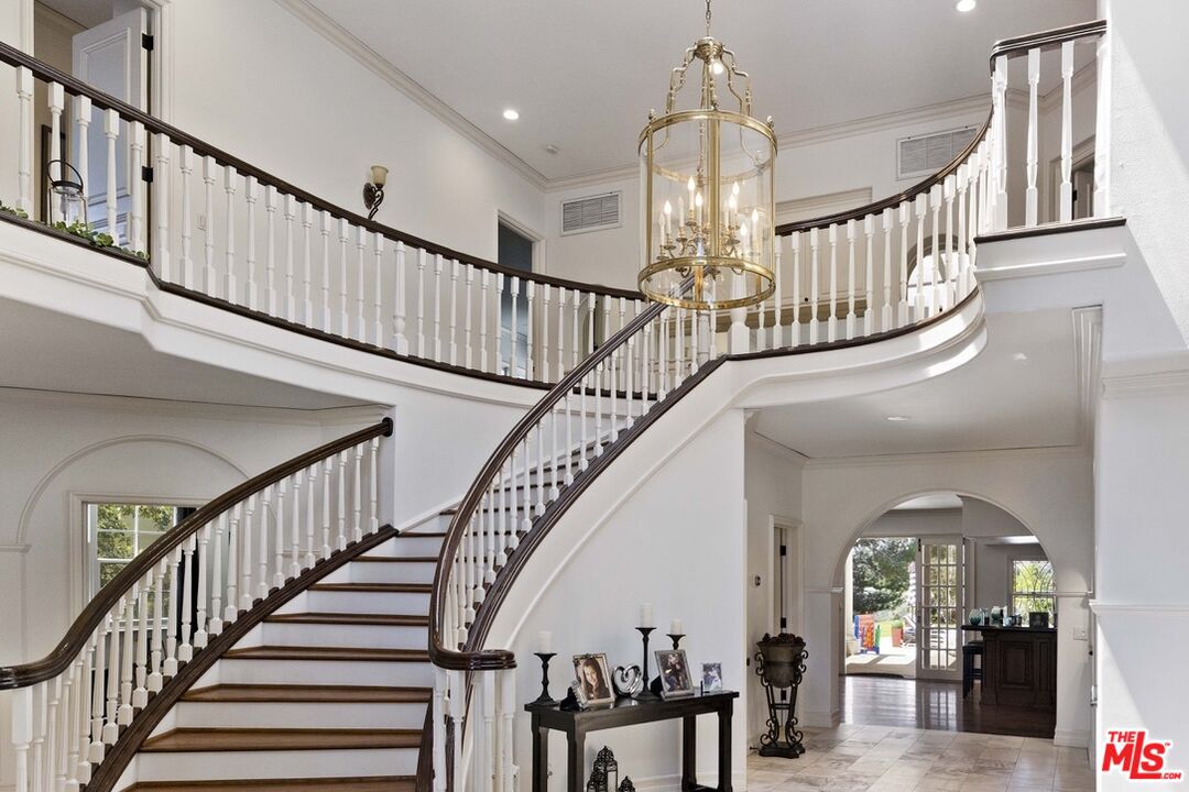 Elegantly updated with a spiral staircase and sky-lit entrance, an open floor plan, 20-foot ceilings, and tile and hardwood floors, this Calabasas Mansion is ideal for entertaining.
