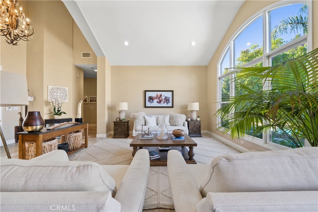 As you enter through the impressive front door made of wrought iron and wood, you’re welcomed into a bright and spacious living area. The soaring ceilings, crystal chandeliers, and beautifully tumbled-edge travertine floors create an elegant ambiance, with views of the pool and garden adding to the charm.