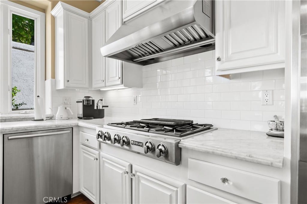 The kitchen is a true invitation for your guests, featuring a large Carrara marble central island and countertops, a farmhouse sink, a six-burner stove, and ethereal crystal pendant lighting. The alabaster cabinetry, stainless-steel appliances, and refinished hardwood floors make this kitchen a true entertainer’s delight.