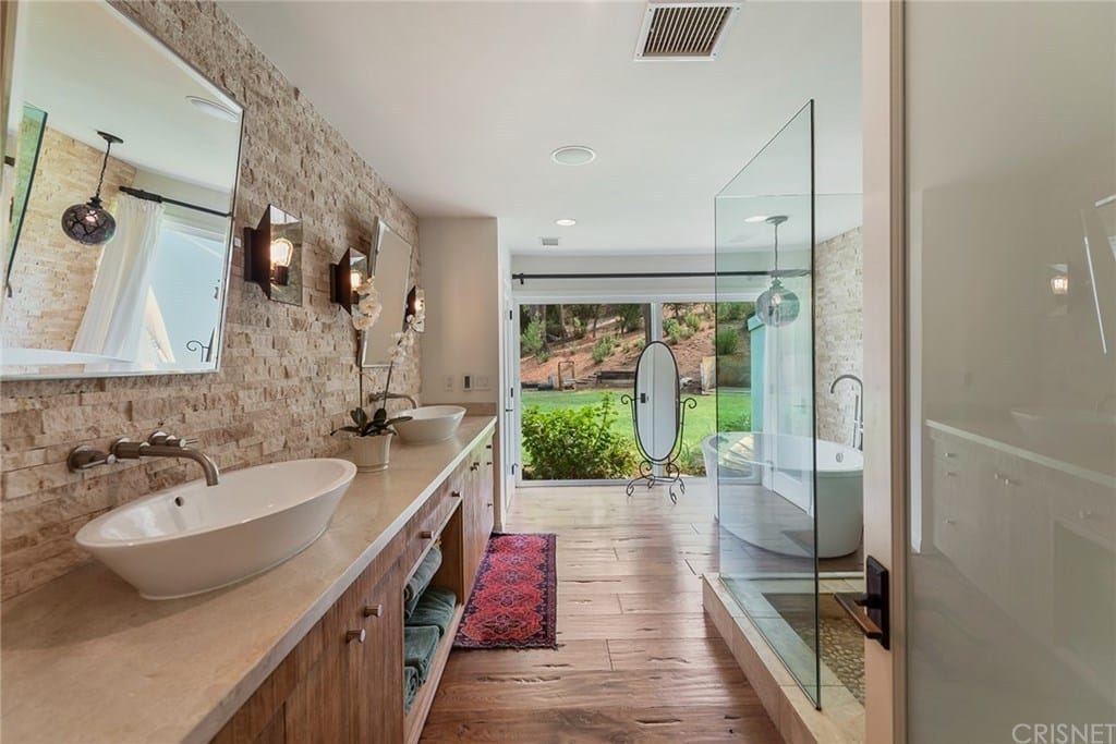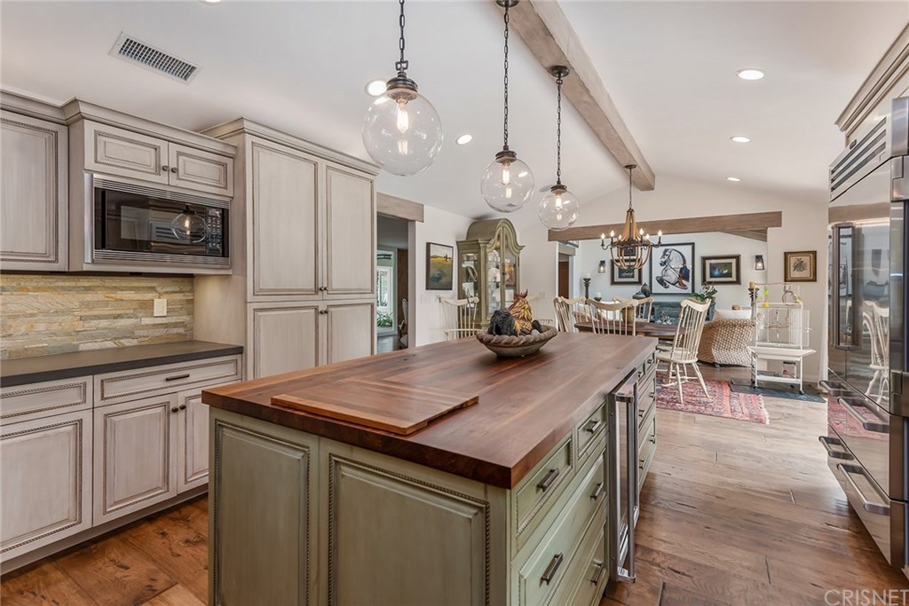 This Agoura Hills mansion offers top of the line amenities such as vaulted ceilings, spacious bedrooms, a gourmet, center island chef’s kitchen with Viking & Sub-Zero appliances, custom cabinetry, refrigerated wine storage, and granite & butcher block countertops, hickory wood flooring, a smart home system and water purification system.