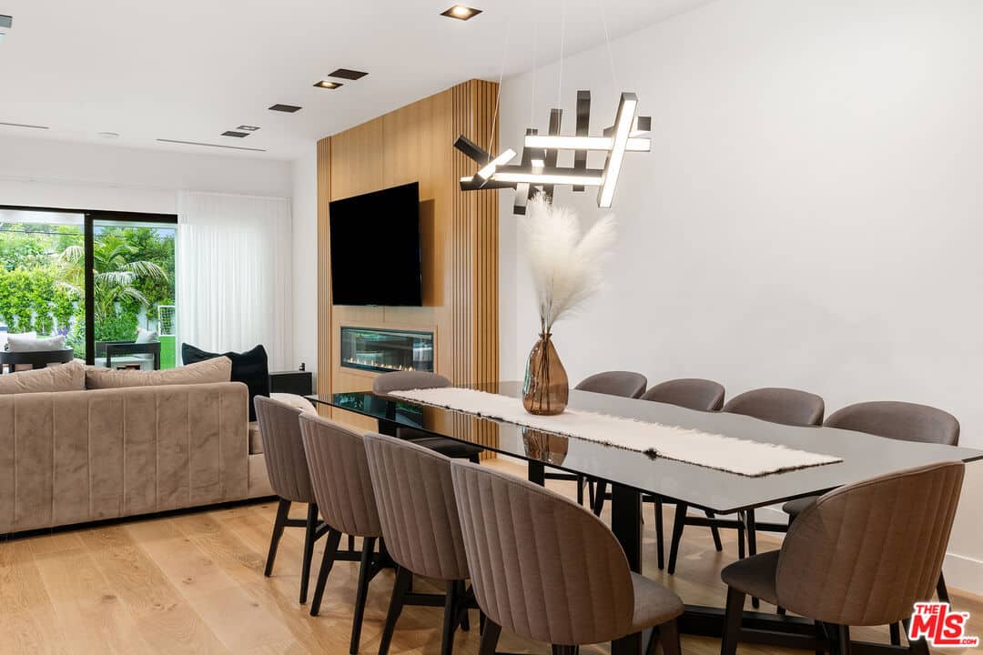 The chef’s kitchen is a true work of art and features double islands and top-of-the-line finishes. Perfect for hosting gatherings is the adjacent dining area with a bar.