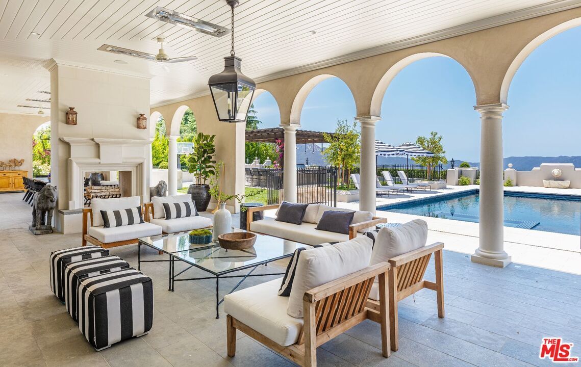 Expansive accordion doors open to an outdoor oasis with an oversized pool and sports court, lush lawns serene atrium and rose garden conservatory pergolas fire pit and a charming orchard.
