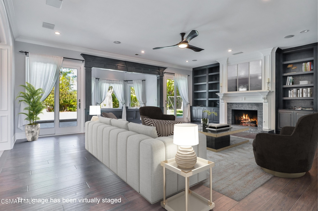 Lastly, modern pendant lighting adds to its contemporary yet timeless design. This family room off the kitchen is truly remarkable and offers a relaxed atmosphere with spectacular features such as a newly refurbished fireplace, dual sliders, built-in speakers and bookcases, as well as a cozy reading nook showcasing picturesque views of the backyard through bay windows.