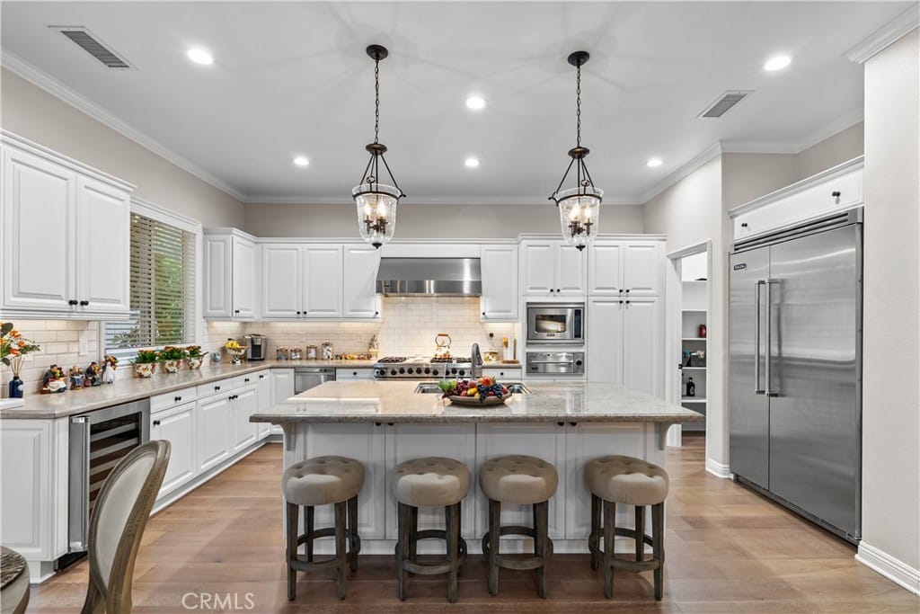 The Chef’s Kitchen, open to the family area, is a culinary dream with all Viking appliances, including a 48” dual-fuel range with six burners, a griddle, and a double oven. Additional features include a wine cooler, warming oven, dining area, large center island with ample counter space, a desk area, a walk-in pantry, and a butler’s pantry or dry bar.