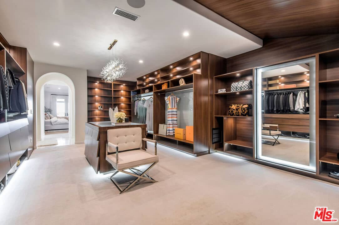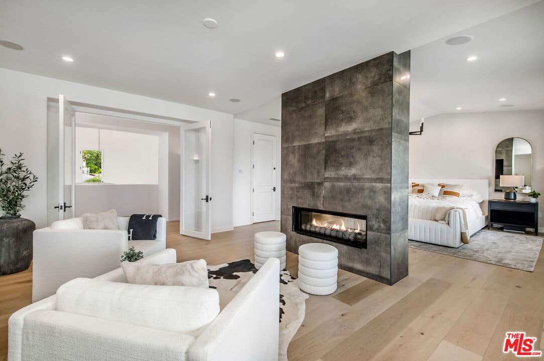The Primary Suite is a rare gem, featuring a cozy seating area and a bedroom with a two-sided modern fireplace for added separation. The spa-like bathroom is a modern classic with a custom soaking tub, double vanities, and a designer two-person shower. The walk-in closet is a work of art, showcasing unparalleled craftsmanship, captivating finishes, a private boutique with display cases, ample storage, and designer cabinetry with artful accent lighting.