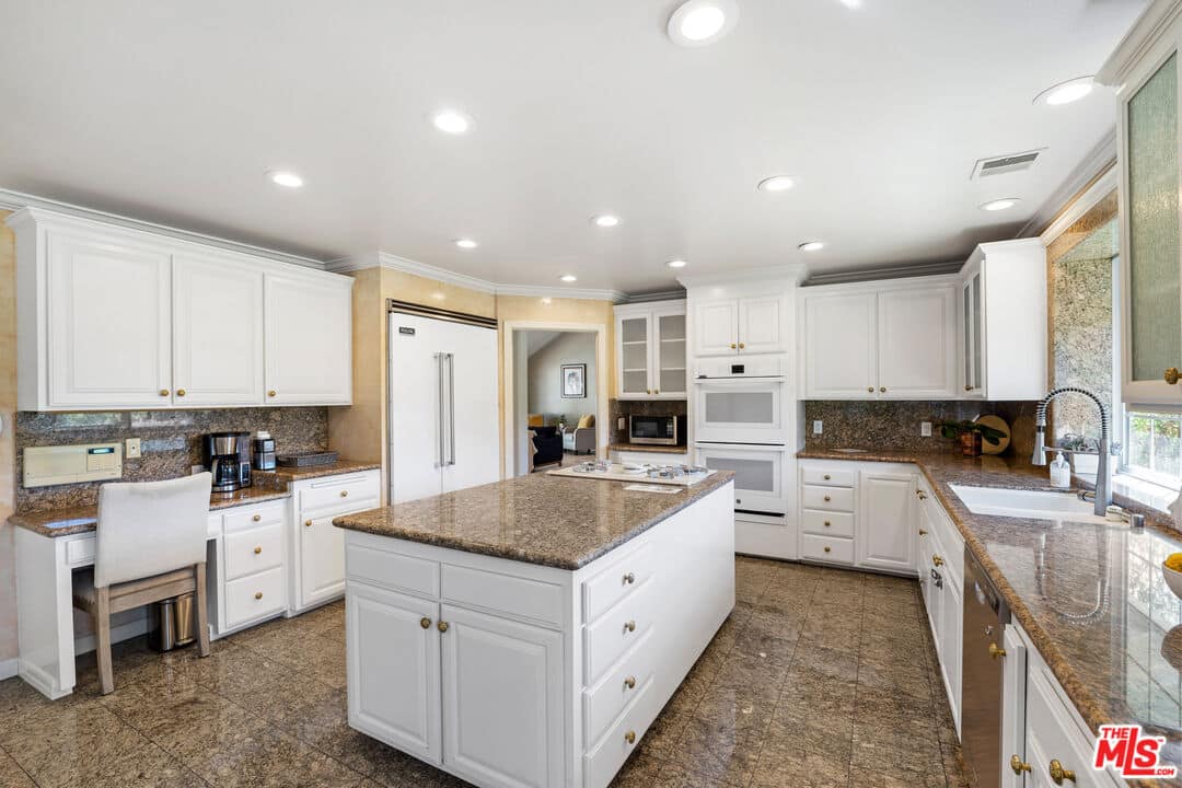 The well-appointed kitchen features granite countertops, white cabinets, a large island, double stacked ovens and Viking Professional refrigerator.