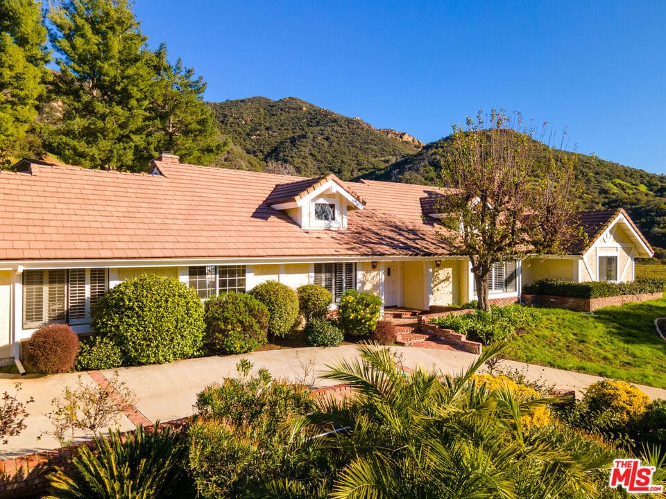 With over 4,600 sqft of living space on 1.48 acres of land, it is surrounded by the idyllic scenery of the Santa Monica Mountains & a driveway lined with Rose Bushes and Palm Trees. Natural light floods into an open floor plan complete with a custom wet bar, vaulted ceilings with fans and fireplaces in both the living spaces and guest bathrooms.