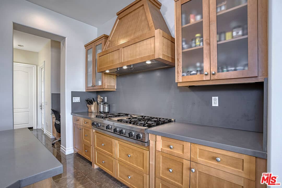 The family room, with its fireplace and built-in cabinets, is seamlessly connected to the kitchen and yard. An en-suite bedroom, a laundry room, and a powder room are conveniently located nearby. Additionally, there’s a separate room with mirrored walls and an en-suite bathroom, complete with French doors that open to the pool area. This room can serve as a gym, office, or an additional suite. For movie enthusiasts, a separate theater with luxury stadium seating awaits.