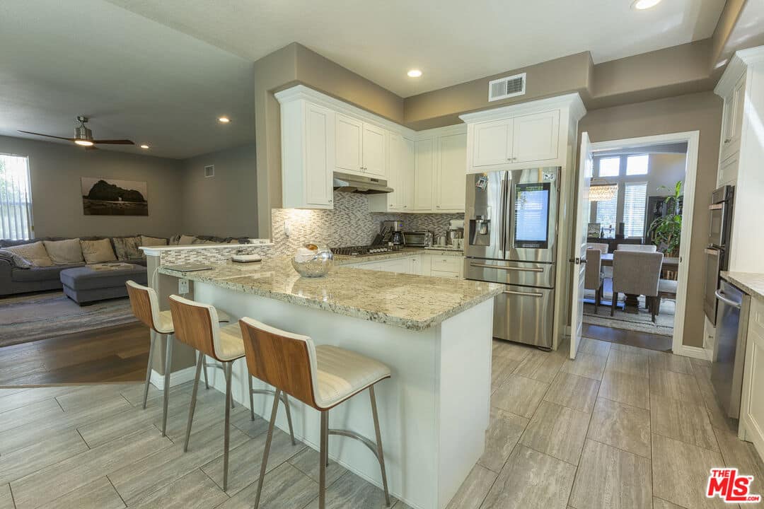 With granite counters, stone backsplash, stainless steel appliances, and a cozy office nook, the remodeled kitchen has plenty of counter and cabinet space, a large island, and granite counters.