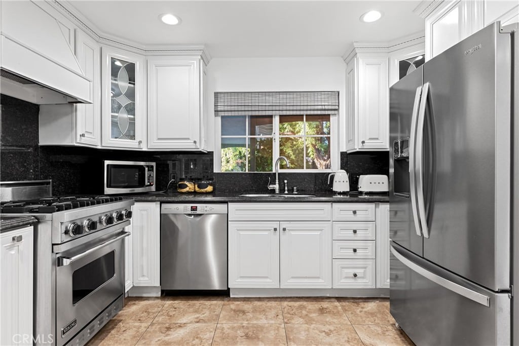 A spacious living room with a cozy fireplace and french doors open up to the beautiful fenced backyard, covered patio, and pool. The entire house is filled with natural light. The remodeled kitchen is equipped with stainless steel appliances, including a Viking 5-burner stove and breakfast bar seating. Granite countertops add a touch of elegance to the space.