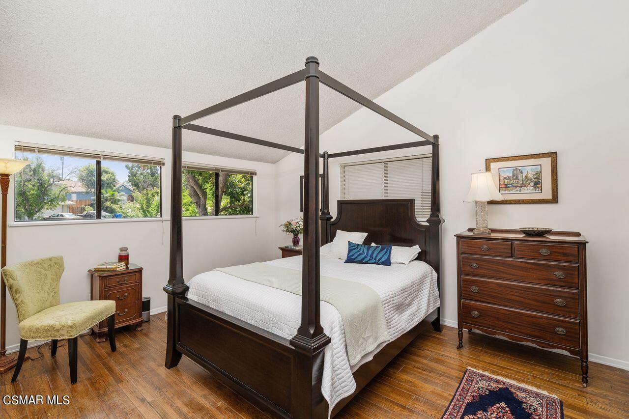 The primary bedroom suite comes with sky high ceilings, wooden floors plus a renovated bathroom featuring a chic vanity.