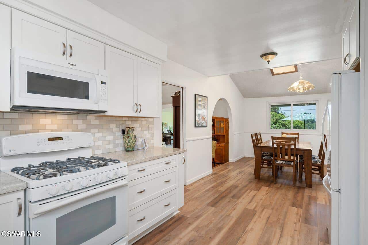 The sleek open concept kitchen is outfitted with white cabinets topped off with quartz countertops and subway tile backsplash in tranquil hues.