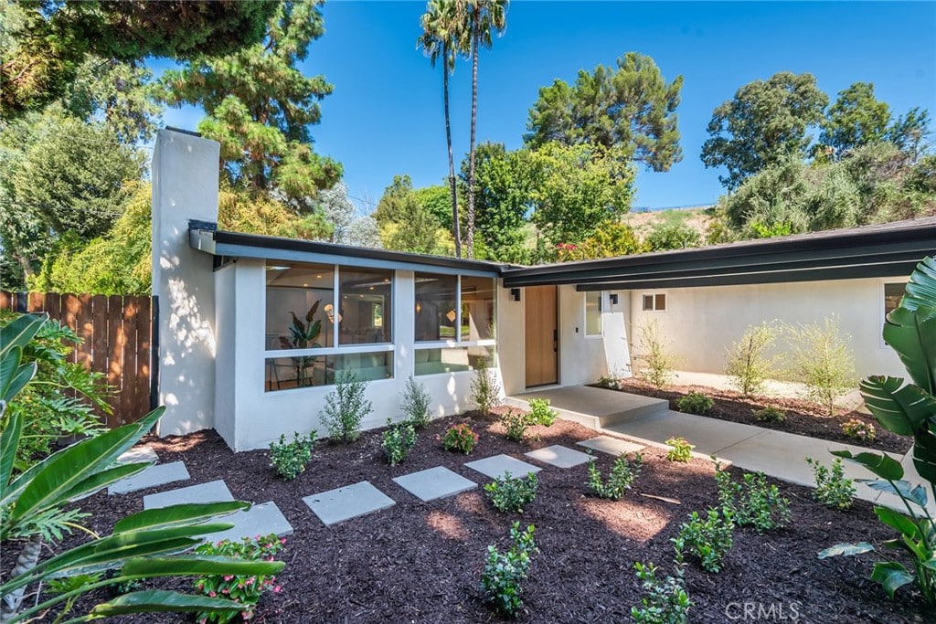 Welcome to a thoughtfully Woodland Hills modern pool home, situated in the desirable neighborhood south of the boulevard. As you enter through the lush private courtyard, the living space boasts high beam ceilings and courtyard views, creating a warm and welcoming ambiance.