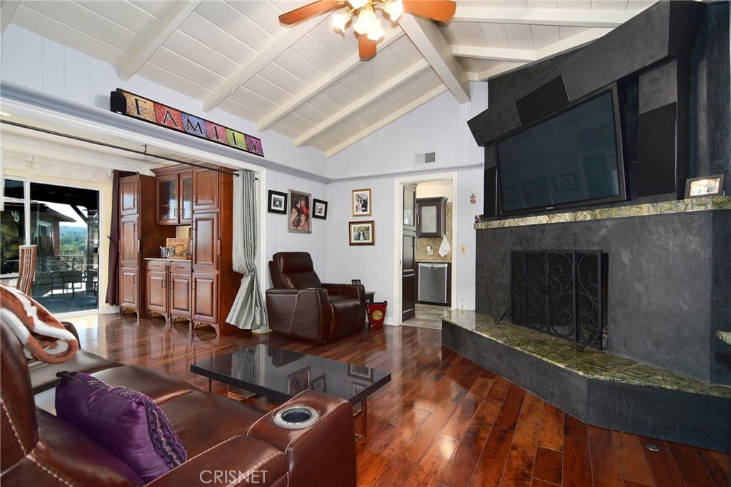 An adjacent FAMILY ROOM gives an even cozier atmosphere with vaulted wood-beam ceilings and another gas and wood burning fireplace. Enjoy quality counter and cabinet space in the kitchen with solid wood custom cabinetry, granite countertops, stainless steel appliances, and a wooden paneled Sub Zero fridge.