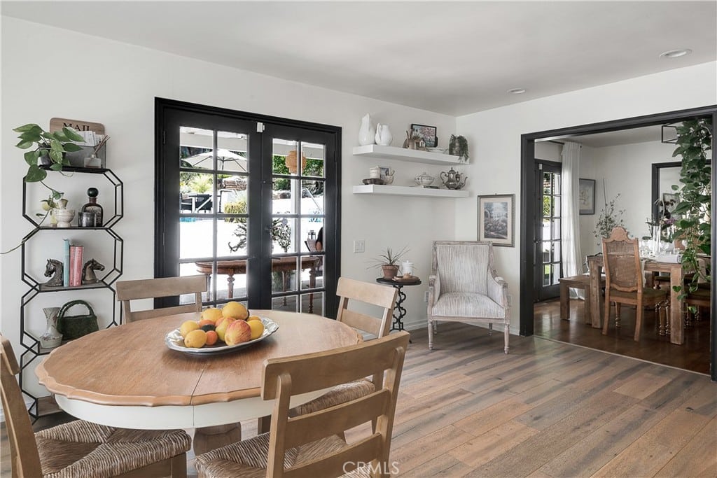 The central island with bar seating as well as breakfast nook surrounded by large French doors offer captivating views to the outdoor area and a charming spot for casual dining.