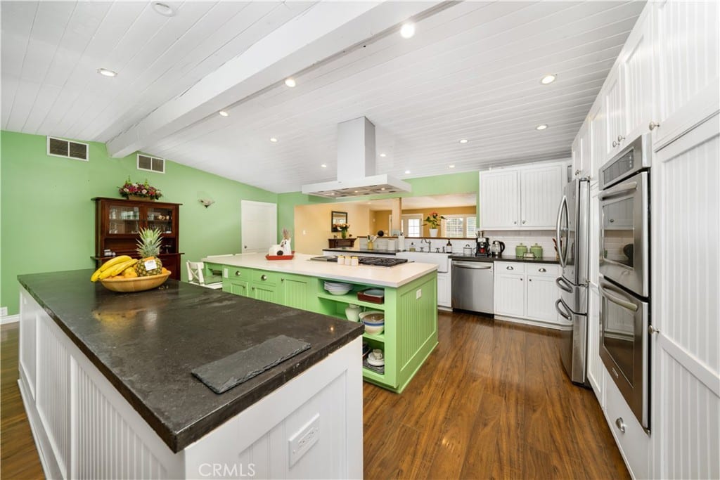 It features two center islands, newly-built country-style bead board cabinets with soft closing drawers, decorative open shelving, Blum hardware, and a farm sink. You’ll also love the stainless steel appliances which include a convection double oven, 6-burner commercial grade cooktop with grill, Gaggenau vent hood, ice maker, dishwasher and internet connected French-door freezer refrigerator.